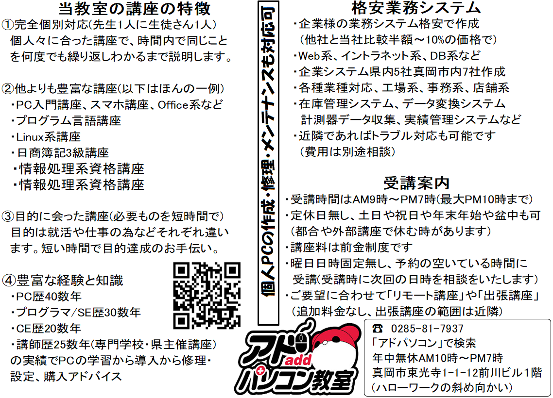 アドパソコン教室は真岡市にあるパソコン教室です。